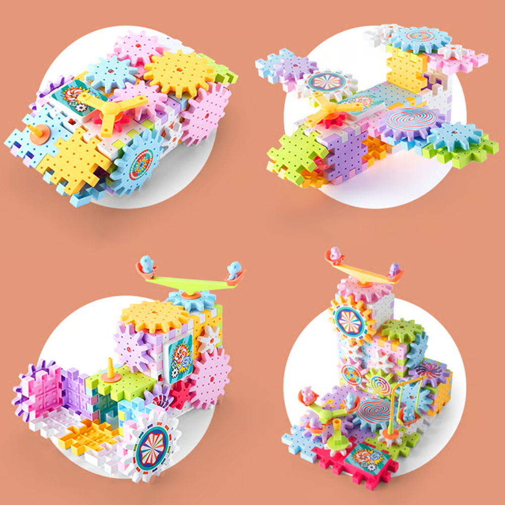 Enhance child hand-eye coordination and design skills by building different shaped gears and blocks!