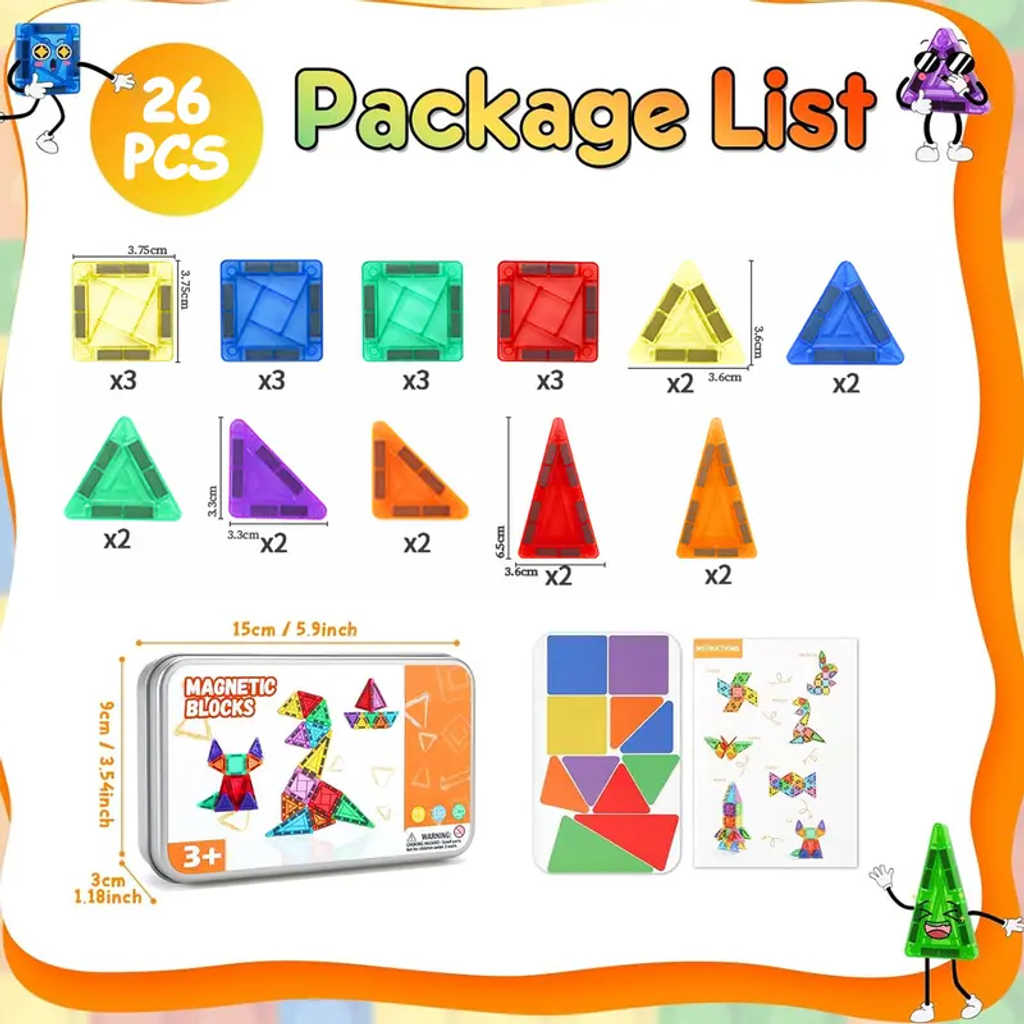 The tiles feature strong neodymium magnets that won't weaken, smooth, burr-free edges for safety, and a durable metal storage case that can withstand serious rough play and travel abuse.