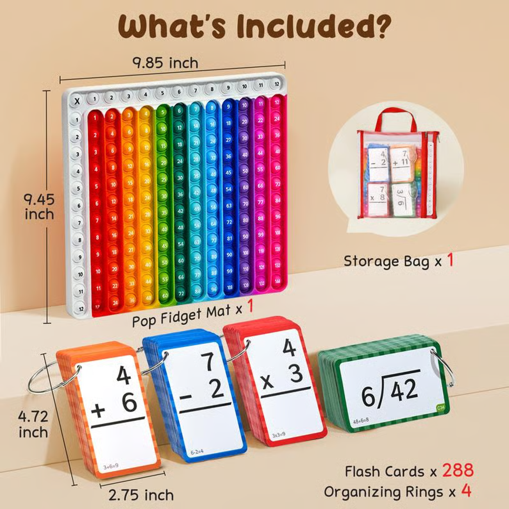 Long-Lasting Quality and Sturdy: The math manipulatives set comes with a pop fidget mat,72 addition flash cards,72 multiplication flash cards, 72 subtraction flash cards, 72 division flash cards,4 organizing rings and 1 storage bag.Child can write answers on the cards and can be written and modified repeatedly